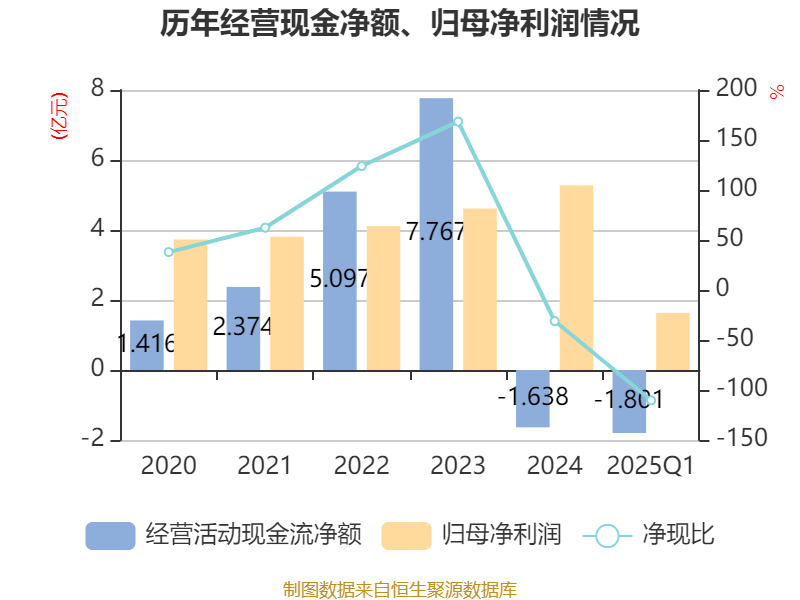 截至2025年一季度末,公司經(jīng)營活動現(xiàn)金流凈額為-1.8億元,同比減少1.49億元;籌資活動現(xiàn)金流凈額2720.73萬元,同比增加7807.55萬元;投資活動現(xiàn)金流凈額-3867.18萬元,上年同期為-656.33萬元。