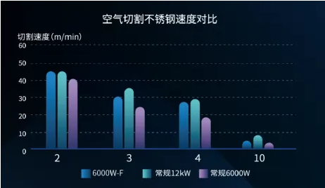 • 6000S-F機型:相比6000W常規(guī)版本,F(xiàn)系列6000W在10mm以下薄板切割效率均有20%—60%的明顯提升。其中2mm薄板的切割速度比常規(guī)12000W甚至提升11%。