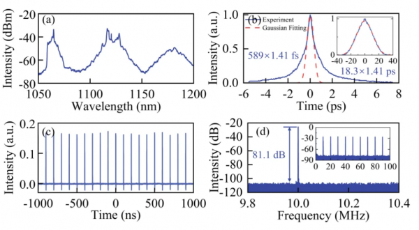 (a)光譜;(b)自相關(guān)曲線;(c)脈沖序列;(d)RF譜