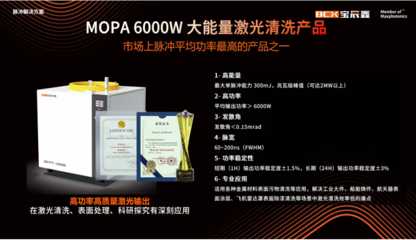 寶辰鑫MOPA 6000W脈沖光纖激光器,是市場上脈沖平均功率最高的產(chǎn)品之一,具有兆瓦級峰值(可達2MW以上),300mJ高單脈沖能量,發(fā)散角<0.15mrad,脈寬60~200ns(FWHM),短期(1H)輸出功率穩(wěn)定度±1.5%,長期(24H)輸出功率穩(wěn)定度±3%,在加工精度、穩(wěn)定性、控制等方面具備顯著優(yōu)勢,可在工業(yè)大件、船舶鑄件、航天器表面涂層、飛機雷達罩表面除漆清洗等領域里實現(xiàn)典型應用。