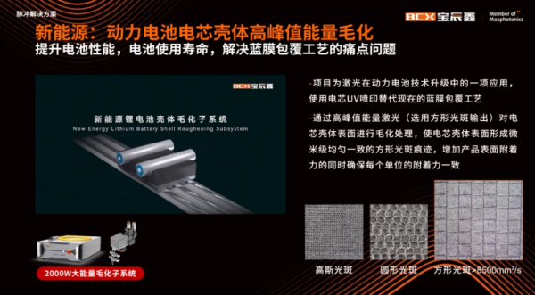 在新能源領域,動力電池殼體毛化項目采用 BFPT 2000W MOPA脈沖方案,通過高峰值能量激光(選用方形光斑輸出)對電芯殼體表面進行毛化處理,使電芯殼體表面形成微米級均勻一致的方形光斑痕跡,增加產(chǎn)品表面附著力的同時確保每個單位的附著力一致。