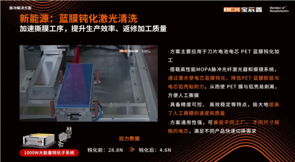 藍膜鈍化項目中,搭載高性能MOPA脈沖光纖激光器和振鏡系統(tǒng)的一體化脈沖方案,通過激光使電芯藍膜鈍化,降低PET 藍膜膠層與電芯鋁殼粘附力,從而使 PET 膜與鋁殼易剝離,鈍化前拉力28.8N,鈍化后僅為4.6N,方便人工撕膜。
