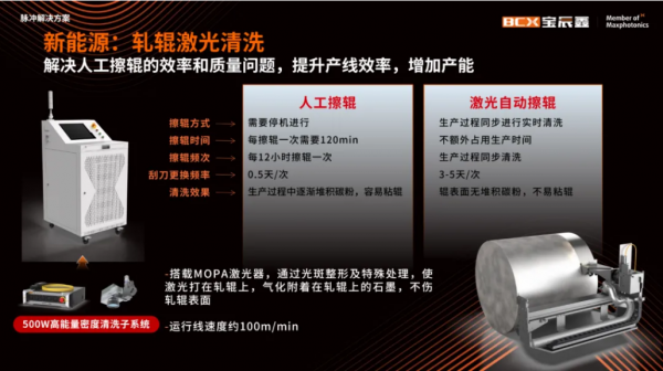 在軋輥清洗應用上,通過激光自動擦輥方案,解決人工擦輥的效率和質量問題,提升產(chǎn)線效率,增加產(chǎn)能。方案搭載500W MOPA激光器,通過光斑整形及特殊處理,使激光打在軋輥上,氣化附著在軋輥上的石墨,不傷軋輥表面。
