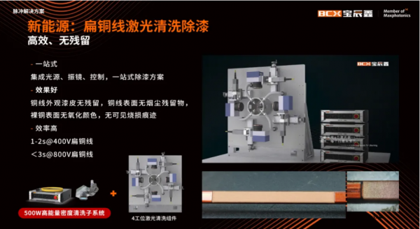 針對扁銅線清洗應用需求,集成光源、振鏡、控制,一站式除漆方案,效率高、效果好,400V扁銅線清洗完成時間1-2s,800V扁銅線<3s即可完成。