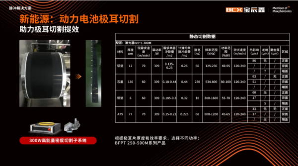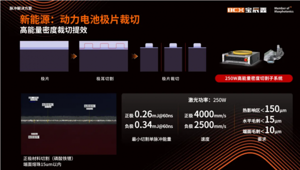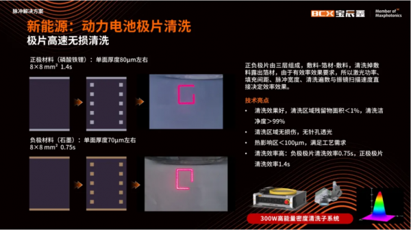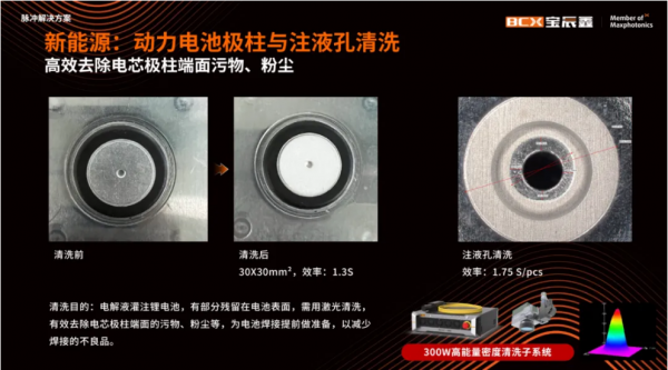除此以外,在新能源領域中,MOPA脈沖解決方案在極耳切割、極片裁切、極片清洗、極柱及注液孔清洗中同樣有著豐富且高效的應用。