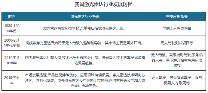 發(fā)展歷程來(lái)看,我國(guó)激光雷達(dá)行業(yè),在2000年以前,激光雷達(dá)的商業(yè)化技術(shù)以及智能網(wǎng)聯(lián)行業(yè)均處于起步階段,激光雷達(dá)在車(chē)載領(lǐng)域應(yīng)用有限。21世紀(jì)以來(lái)激光雷達(dá)的系統(tǒng)架構(gòu)得到拓展,從單線掃描逐漸發(fā)展到多線掃描,激光雷達(dá)對(duì)環(huán)境三維高精度重建的應(yīng)用優(yōu)勢(shì)被逐漸認(rèn)可,基于激光雷達(dá)的避障與導(dǎo)航技術(shù)在無(wú)人駕駛應(yīng)用中得到逐步發(fā)展。2016年后,在汽車(chē)產(chǎn)業(yè)“電氣化、共享化、網(wǎng)聯(lián)化、智能化”的“新四化”驅(qū)動(dòng)下,隨著無(wú)人駕駛行業(yè)高速發(fā)展,激光雷達(dá)行業(yè)也隨之進(jìn)入迅速發(fā)展期。