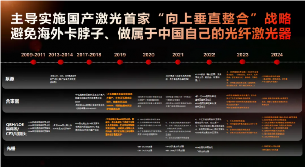 作為國(guó)內(nèi)首批成立的光纖激光器企業(yè),創(chuàng)鑫激光率先實(shí)現(xiàn)了光纖激光器及核心光學(xué)器件兩類核心技術(shù)的垂直整合,自主開發(fā)數(shù)十種光纖激光器高功率核心器件如泵源、QBH、準(zhǔn)直器、合束器、隔離器、聲光調(diào)制器等,全面提升系統(tǒng)可靠性,完成國(guó)產(chǎn)大功率光纖的量產(chǎn)化開發(fā)。后續(xù)更把激光器件垂直整合延伸到了激光核心材料領(lǐng)域,大力推動(dòng)了激光國(guó)產(chǎn)化的發(fā)展,是中國(guó)激光產(chǎn)業(yè)發(fā)展的見證者、參與者和推動(dòng)者。
