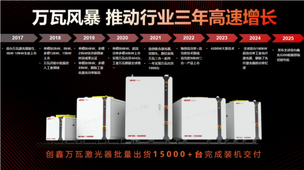 在鞏固單模塊技術(shù)優(yōu)勢(shì)的同時(shí),創(chuàng)鑫激光持續(xù)向更高功率領(lǐng)域進(jìn)軍。憑借深厚的核心器件自研技術(shù)實(shí)力以及對(duì)市場(chǎng)的敏銳洞察,創(chuàng)鑫激光率先開啟行業(yè)萬瓦風(fēng)暴,并緊密圍繞市場(chǎng)需求,相繼推出25kW、40kW、50kW、80kW、100kW、160kW等一系列高功率光纖激光器產(chǎn)品,不斷刷新并保持全球超高功率紀(jì)錄,引領(lǐng)光纖激光器向高功率、超高功率方向邁進(jìn)。