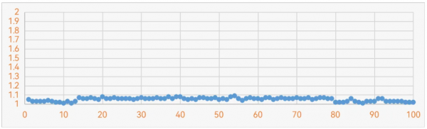 同時,由于3D打印設(shè)備多為多光源作業(yè),因此多臺光源的光束質(zhì)量一致性又尤為重要。通過從產(chǎn)線隨機(jī)拉取的百臺3D打印專用光源出廠測試數(shù)據(jù)顯示,該系列光源全部穩(wěn)定在1.0至1.1之間,一致性極強(qiáng)。