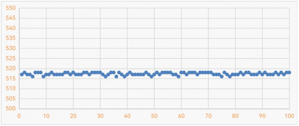 激光功率的一致性及多批次激光器的功率一致性,是穩(wěn)定的激光能量的基礎(chǔ)。通過產(chǎn)線隨機(jī)拉取的百臺光源的功率數(shù)據(jù)顯示,寶辰鑫3D打印專用激光器的功率穩(wěn)定在515至520之間,并可根據(jù)客戶需求設(shè)置一定量的功率余量,以確保不會受長期使用之下功率衰減的影響。