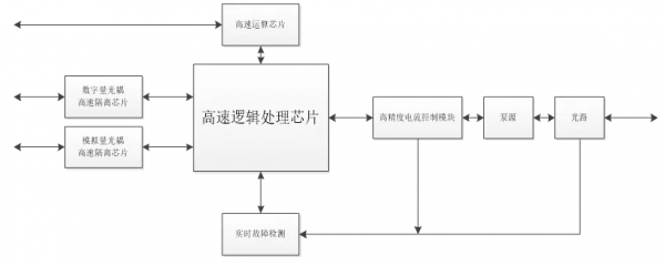輸入輸出接口則采用高速的數(shù)字量和模擬量隔離光耦,由此保證激光器控制的高速與一致性。同時配合高精度電流控制模塊,保證光源供電的穩(wěn)定性,從而實現(xiàn)輸出激光功率的高穩(wěn)定性。