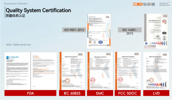 在產(chǎn)品認(rèn)證方面,寶辰鑫BFSC 300-1000 CW 連續(xù)系列 (1U)產(chǎn)品完成全球CE、FDA認(rèn)證,基本覆蓋全球客戶的需求。寶辰鑫將繼續(xù)堅守產(chǎn)品品質(zhì)管理,嚴(yán)格把關(guān)產(chǎn)品質(zhì)量,讓中國造在世界贏得優(yōu)良口碑。