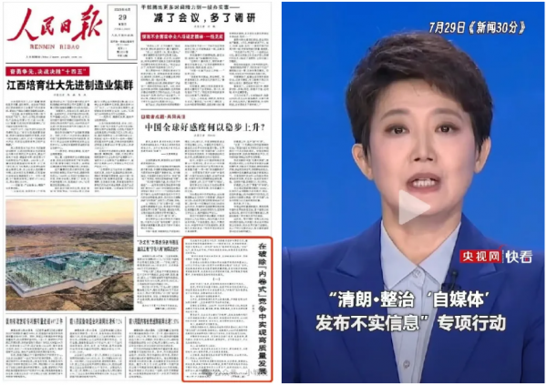 ▲《人民日報》頭版發(fā)表文章《在破除“內(nèi)卷式”競爭中實現(xiàn)高質(zhì)量發(fā)展》,直指內(nèi)卷惡疾。中央網(wǎng)信辦從7月24日起開展為期兩個月“清朗·整治自媒體發(fā)布不實信息”專項行動。