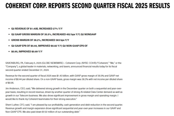 Coherent近期兩年業(yè)務(wù)表現(xiàn)亮眼。2025財年第二季度,公司營收增長27%,通信市場營收占比57%,工業(yè)市場占31%。電信業(yè)務(wù)營收連續(xù)三個季度環(huán)比增長,本季度同比上升21%,數(shù)據(jù)中心互聯(lián)(DCI)是主要驅(qū)動力。受人工智能和機(jī)器學(xué)習(xí)(AI/ML)收發(fā)器件需求推動,Coherent過去四個季度在手訂單和積壓訂單首次連續(xù)增長。為聚焦高增長領(lǐng)域,公司已戰(zhàn)略性終止非核心業(yè)務(wù),集中資源投向潛力市場。