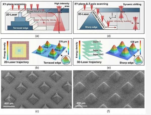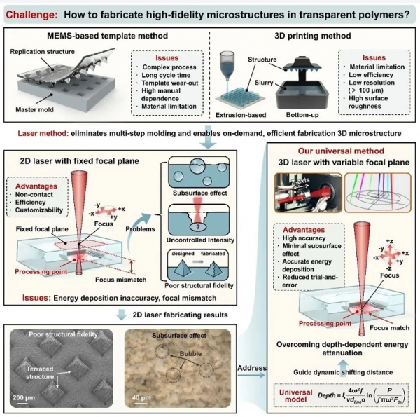 目前主流的模板復(fù)制法雖精度高,但流程復(fù)雜、成本高、周期長,難以滿足定制化和快速迭代的需求;3D打印和雙光子聚合等新興方法則在分辨率、適配材料范圍等方面仍存在權(quán)衡;傳統(tǒng)2D激光加工工藝焦平面固定,難以應(yīng)對因加工過程中焦點失配導(dǎo)致的能量沉積不準(zhǔn)確的問題。因此,亟需一種兼顧精度、效率與材料兼容性的微結(jié)構(gòu)加工技術(shù),以滿足透明柔性聚合物器件快速發(fā)展的迫切需求。