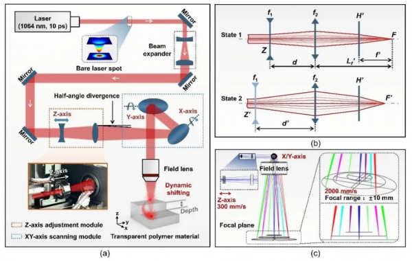 圖2 3D動態(tài)聚焦激光加工系統(tǒng)與原理:(a)系統(tǒng)設(shè)置示意圖;(b)動態(tài)調(diào)焦的工作原理;(c)基于擬議激光制造裝置的三軸激光掃描系統(tǒng)的光路模擬結(jié)果
