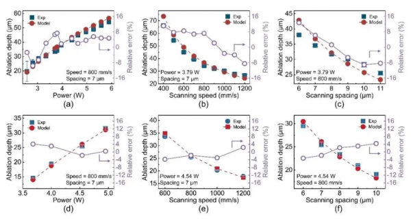 式中,ω為束腰半徑、f為激光頻率、v為掃描速度、d_line為掃描線間距、P為激光功率、F_th為燒蝕閾值、α為材料吸收系數(shù)、ξ為修正系數(shù)。通過實驗獲取材料燒蝕閾值與材料吸收系數(shù),即可實現(xiàn)精準(zhǔn)預(yù)測燒蝕深度。利用該預(yù)測模型在代表性聚合物材料PDMS和PET上進行了驗證,預(yù)測結(jié)果的平均絕對百分比誤差(MAPE)分別為5.99%和2.68%(見圖4)。