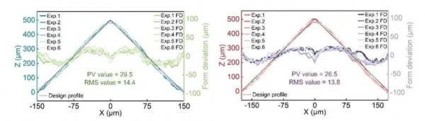 團隊通過設(shè)計不同尺寸的金字塔結(jié)構(gòu),評估了3D動態(tài)聚焦激光加工的精度。結(jié)果表明結(jié)構(gòu)高度增加會帶來絕對誤差累積,但歸一化后,峰谷(PV值)誤差均低于8%、均方根(RMS)誤差低于3%,展現(xiàn)出優(yōu)異的加工精度(見圖5)。