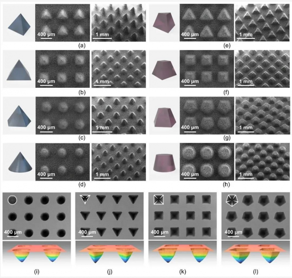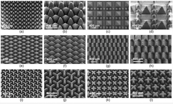 圖6 PDMS基底上加工凸起和凹陷的不同類型的棱錐和棱臺微結(jié)構(gòu)