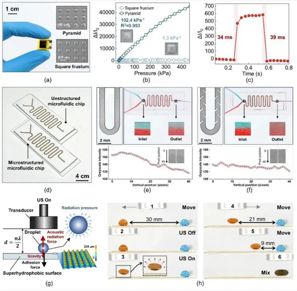 圖9 使用3D-DFL方法制造的微結(jié)構(gòu)應(yīng)用:(a-c) 壓阻式壓力傳感器應(yīng)用;(d-f) 微流控芯片應(yīng)用;(g-h) 液滴操控應(yīng)用