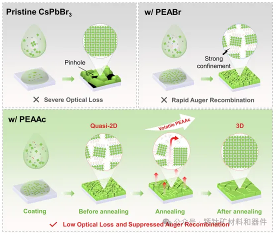 浙江大學(xué)和先進材料與化學(xué)工程研究所的研究人員開發(fā)了一種簡單的方法來克服這一挑戰(zhàn),使鈣鈦礦激光器在近乎連續(xù)運行下的性能創(chuàng)下了記錄。新方法在多晶鈣鈦礦薄膜的退火過程中使用揮發(fā)性銨添加劑。這種添加劑會觸發(fā)“相重建”,去除不需要的低維相,減少加速俄歇復(fù)合的通道。其結(jié)果是產(chǎn)生純3D結(jié)構(gòu)鈣鈦礦,可以更好地保留激光所需的電荷載流子,而不會增加顯著的光學(xué)損耗。