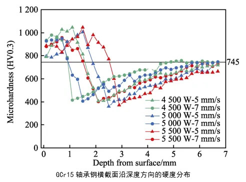軸承是現(xiàn)代機(jī)械工程和設(shè)備中至關(guān)重要的組成部分,它在航空、汽車、高速列車等行業(yè)中發(fā)揮著重要作用。高速列車軸承的服役條件較特殊,工作時(shí)需要承受極高的轉(zhuǎn)速和相應(yīng)的離心力,運(yùn)行過程中會(huì)受到?jīng)_擊、腐蝕及高溫的作用。高速列車軸承長(zhǎng)期受到周期交變應(yīng)力的作用,其疲勞損傷成為其最常見的損傷形式,通常發(fā)生在軸承的滾動(dòng)體與滾道之間。該損傷形式主要因?yàn)橹貜?fù)的應(yīng)力作用,材料逐漸疲勞,最終形成微小裂紋,這些裂紋隨著時(shí)間的推移而擴(kuò)大,導(dǎo)致軸承失效。為了提升高速列車軸承的使用壽命,需對(duì)其表面進(jìn)行強(qiáng)化處理。目前,軸承強(qiáng)化處理以傳統(tǒng)爐內(nèi)熱處理為主,該種方式難以同時(shí)保障表面的高硬度和心部的高韌性,且其能源消耗較大。激光表面處理技術(shù)具有傳統(tǒng)方法不可比擬的優(yōu)勢(shì),可獲得比常規(guī)爐內(nèi)熱處理、感應(yīng)熱處理更高的硬度,進(jìn)一步提高其表面性能,同時(shí)不會(huì)改變心部韌性,故成為高速列車軸承表面性能提升的有效途徑。GCr15 軸承鋼是高速列車軸承常用的材料,其淬透性強(qiáng),采用常規(guī)激光淬火技術(shù)形成的硬化層深度一般在1 mm以內(nèi),難以滿足 GCr15 高速列車軸承深層強(qiáng)化的需求。本文采用深層激光固態(tài)相變技術(shù)對(duì)GCr15 軸承鋼進(jìn)行表面強(qiáng)化處理,以期提高GCr15軸承鋼的表面硬度和強(qiáng)化層深度。通過控制工藝參數(shù)得到不同深度的強(qiáng)化層,并采用線接觸圓盤式滾動(dòng)接觸疲勞測(cè)試裝置進(jìn)行疲勞實(shí)驗(yàn),研究其疲勞損傷機(jī)理,探討強(qiáng)化層深度對(duì)滾動(dòng)接觸疲勞性能的影響,擬為GCr15 軸承鋼的表面強(qiáng)化提供參考。