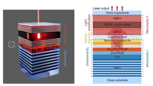 “為了實現(xiàn)電驅動激光發(fā)射,我們發(fā)明了一種集成式的雙腔結構。我們的方案是,將高功率微腔鈣鈦礦LED子單元與高質量單晶鈣鈦礦微腔子單元緊湊地集成在同一器件中?!钡掖笮l(wèi)介紹。該器件將微腔鈣鈦礦LED在電激勵下產(chǎn)生的大量光子高效地耦合到第二個微腔中,并激發(fā)單晶鈣鈦礦增益介質,產(chǎn)生激光。