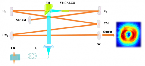 然而,當(dāng)前主流超快渦旋光束生成技術(shù)依賴于外部相位調(diào)制元件(如空間光調(diào)制器、超表面等),存在損傷閾值低、帶寬受限、易引入散射和畸變等問題,難以同時(shí)實(shí)現(xiàn)高能量與超短脈沖的輸出。針對這一技術(shù)瓶頸,研究團(tuán)隊(duì)創(chuàng)新性地提出了一種基于Yb:CALGO晶體的渦旋激光振蕩器結(jié)構(gòu),通過半導(dǎo)體可飽和吸收鏡(SESAM)輔助克爾鎖模與點(diǎn)缺陷鏡調(diào)控的協(xié)同機(jī)制,在諧振腔內(nèi)直接產(chǎn)生了超短脈沖渦旋光束。
