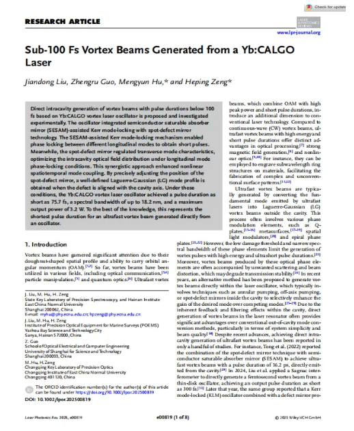 近日,華東師范大學(xué)精密光譜科學(xué)與技術(shù)國家重點(diǎn)實(shí)驗(yàn)室曾和平教授團(tuán)隊(duì)在超快渦旋激光領(lǐng)域取得重要突破,成功實(shí)現(xiàn)了脈沖寬度低于100飛秒的高功率渦旋光束的腔內(nèi)直接生成。該研究成果以Sub-100 Fs Vortex Beams Generated from a Yb:CALGO Laser為題,發(fā)表于光學(xué)領(lǐng)域期刊Laser & Photonics Reviews。