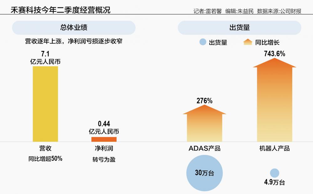 今年二季度,禾賽實(shí)現(xiàn)營(yíng)收7.1億元人民幣,同比增超50%,凈利潤(rùn)0.44億元人民幣,轉(zhuǎn)虧為盈。