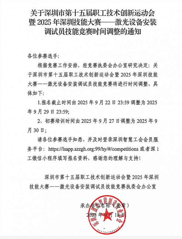 根據(jù)競(jìng)賽工作安排,經(jīng)激光設(shè)備安裝調(diào)試員技能競(jìng)賽執(zhí)委會(huì)辦公室研究決定,激光設(shè)備安裝調(diào)試員技能競(jìng)賽時(shí)間調(diào)整,具體如下:1.報(bào)名截止時(shí)間由2025年9月22日23:59調(diào)整為202...