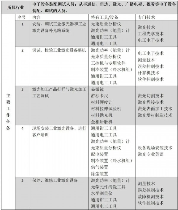 《激光設備安裝調(diào)試員》新職業(yè)列出的主要工作任務