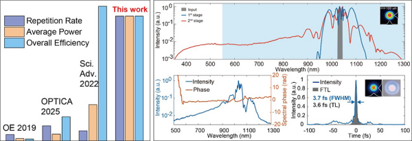 不同單周期脈沖壓縮方案的關鍵指標對比(左),超連續(xù)白光光譜展寬(右上),接近變換極限的單周期飛秒脈沖壓縮結果(右下)
