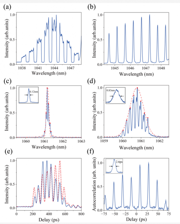圖 2. (a)和(b)光譜整形圖;(c)和(d)基于四波混頻的光譜轉錄結果圖;(e)和(f)消啁啾的高分辨率激光脈沖序列。