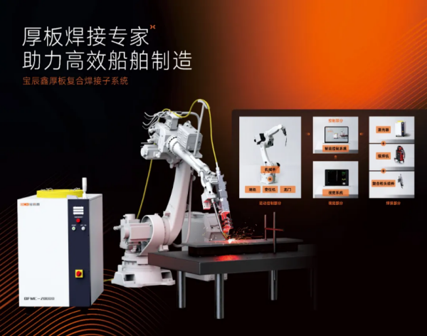 創(chuàng)鑫激光子公司寶辰鑫基于激光-電弧復(fù)合焊技術(shù)推出了船舶復(fù)合焊接子系統(tǒng)的標(biāo)準(zhǔn)化預(yù)集成方案,方案搭載高功率連續(xù)光纖激光器、定制化復(fù)合槍頭組件及高度集成的智能控制系統(tǒng);激光焊接頭與電弧焊接頭通過復(fù)合槍頭結(jié)構(gòu),以雙熱源的方式搭載在機(jī)械手或其他運(yùn)動(dòng)控制平臺(tái)上,并搭配視覺系統(tǒng),實(shí)現(xiàn)高穩(wěn)定、高質(zhì)量的焊接,可應(yīng)用于不銹鋼、碳鋼、鋁合金等厚板材料的拼接焊或角焊等工藝。