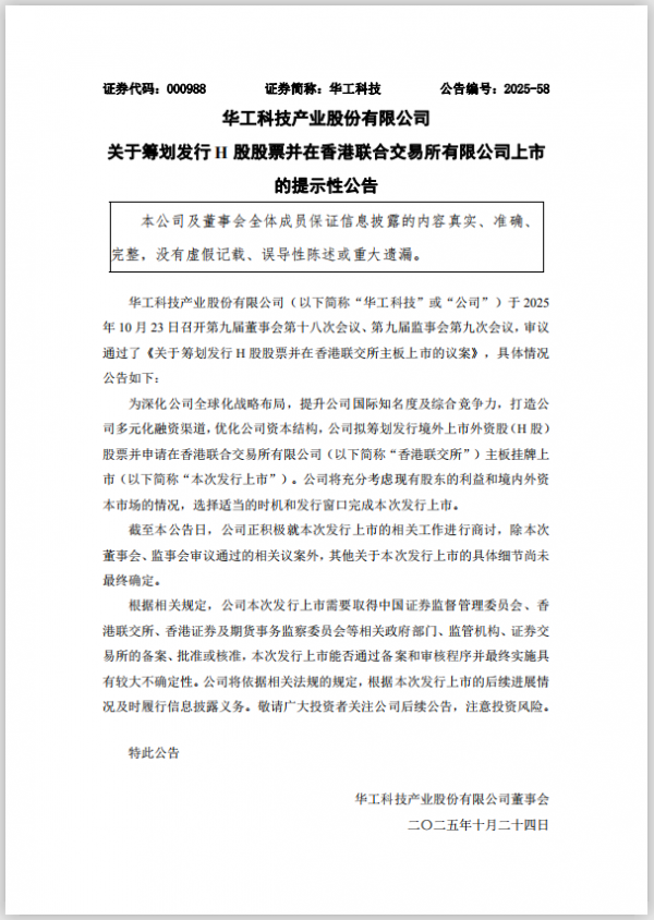 10月24日,華工科技(000988)發(fā)布重磅公告,董事會(huì)與監(jiān)事會(huì)已審議通過發(fā)行H股并在香港聯(lián)交所主板上市的議案。公司明確表示,此次融資將聚焦三大目標(biāo):深化全球化戰(zhàn)略、拓寬融資渠道、優(yōu)化資本結(jié)構(gòu),標(biāo)志著這家光通信與激光裝備領(lǐng)域的龍頭企業(yè)正式啟動(dòng)國(guó)際化資本布局。