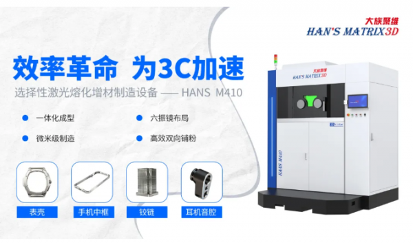 合作的成功落地,離不開金屬3D打印設(shè)備——HANS M410提供的核心支持。作為3C行業(yè)應(yīng)用最廣泛的解決方案,其所具備的卓越制造特性,正成為推動零部件制造升級的關(guān)鍵驅(qū)動力。