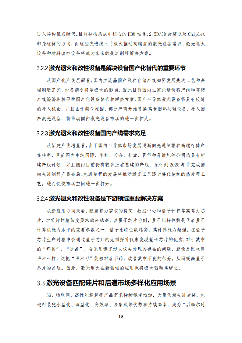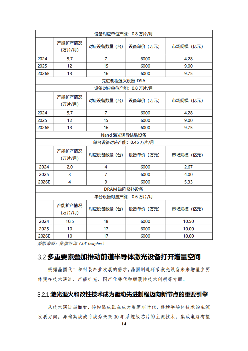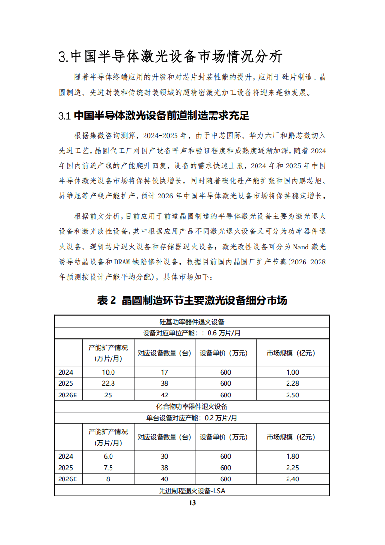 在需求推動下,中國半導(dǎo)體激光設(shè)備前道市場增長強勁,2024 - 2026年各類退火設(shè)備和改性設(shè)備市場規(guī)模持續(xù)擴大。同時,先進(jìn)封裝的發(fā)展帶動后道激光設(shè)備需求增長,激光劃片、打標(biāo)等設(shè)備市場穩(wěn)步提升。