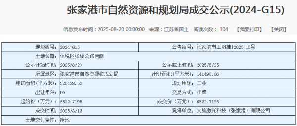 作為激光行業(yè)龍頭企業(yè),大族激光的每一步布局都牽動(dòng)行業(yè)神經(jīng)。2025年8月,大族激光科技(張家港)有限公司以6522.7195萬元競得張家港市保稅區(qū)141490.66平方米工業(yè)用地,為其華東區(qū)域產(chǎn)能擴(kuò)充落下關(guān)鍵一子。該地塊采用江蘇首創(chuàng)的“標(biāo)準(zhǔn)地+雙信地+定制地”出讓模式,政府提供“三凈地”保障,實(shí)現(xiàn)“成交即發(fā)證、交地即開工”,企業(yè)則承諾固定資產(chǎn)投資強(qiáng)度不低于802萬元/畝,彰顯政企協(xié)同發(fā)展的高效性。