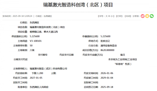 武漢作為“中國光谷”所在地,始終是激光產(chǎn)業(yè)的戰(zhàn)略高地。2025年9月,瑞基激光智造(武漢)科創(chuàng)有限公司以8620萬元拿下東西湖區(qū)5.2256公頃土地,啟動(dòng)總投資17億元的科創(chuàng)灣(北區(qū))項(xiàng)目,計(jì)劃2027年開工、2029年竣工,打造激光產(chǎn)業(yè)創(chuàng)新生態(tài)綜合體。