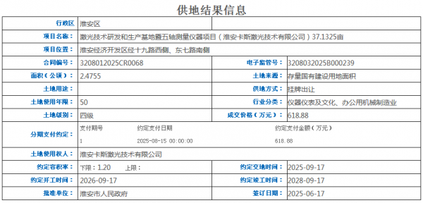在激光產(chǎn)業(yè)高端化進(jìn)程中,核心部件與精密測量技術(shù)的突破成為關(guān)鍵。2025年6月,淮安卡斯激光技術(shù)有限公司以618.88萬元競得淮安經(jīng)濟(jì)開發(fā)區(qū)37.13畝土地,啟動(dòng)激光技術(shù)研發(fā)和生產(chǎn)基地暨五軸測量儀器項(xiàng)目,將于2026年開工、2028年竣工,專注激光核心技術(shù)攻堅(jiān)。