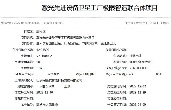 2025年4月,山東鋼豪發(fā)智能科技發(fā)展有限公司以2146萬元拿下淄博周村區(qū)4.4013公頃土地,投資2.8億元建設(shè)激光先進(jìn)設(shè)備衛(wèi)星廠極限智造聯(lián)合體項(xiàng)目,計(jì)劃2026年開工、2028年竣工,聚焦光纖激光切割機(jī)量產(chǎn)。
