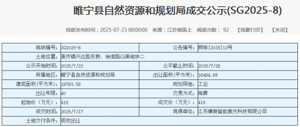在激光產(chǎn)業(yè)向區(qū)域縱深滲透的過程中,縣域經(jīng)濟(jì)成為重要承接載體。2025年7月17日,江蘇博朗智能激光科技有限公司以415萬元底價(jià)競得睢寧縣高作鎮(zhèn)SG2025-8號工業(yè)用地,地塊面積1.649465公頃。該地塊約定2025年12月1日開工、一年竣工,從拿地到投產(chǎn)周期僅18個(gè)月,凸顯中小企業(yè)“快布局、快落地”的發(fā)展特點(diǎn)。