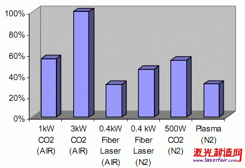 Fig. 2.使用不用種類的激光器加工1mm的不銹鋼板的每年運營成本對比圖