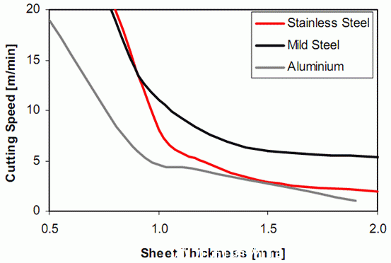 Fig. 4. 小于2mm的低碳鋼、不銹鋼和鋁材使用400W連續(xù)光纖激光器的切割速度對比圖