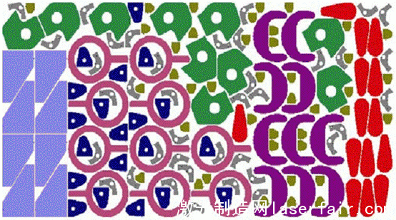 光纖激光切割非常適于高效的排樣組件的切割,典型的排樣切割如圖6所示。由于其切縫窄和較小的熱影響區(qū),工件能緊密地排列在一起,甚至是連接在一起。使用排樣法時,光纖激光系統(tǒng)相比于高精度等離子切割能節(jié)省15%的板材,使制造商從高效、節(jié)能、實用的激光加工(laser oem)系統(tǒng)中獲益。