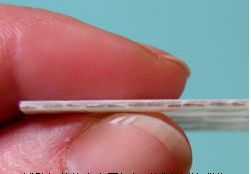 板材樣品如第二幅圖所示,它是由滌綸織物和聚酯薄板粘合而成。此塊樣品的厚度為0.38mm (0.015”),切割速度為19每分(750 IPM),激光器功率為100W。在使用200W的功率時,切割速度可達(dá)38.1每分(1500 IPM)。同樣地,樣品切邊干凈平整無變色。