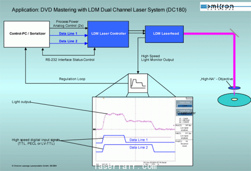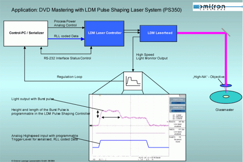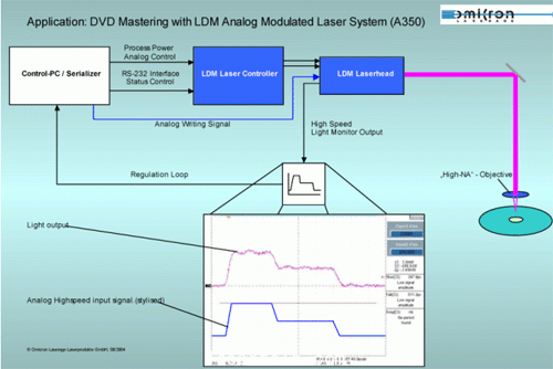DVD 刻寫需要的是最高質(zhì)量的藍(lán)紫光半導(dǎo)體激光器。 光束質(zhì)量越高,波前誤差就越小,聚焦能力才可能達(dá)到所需的250nm或者更小。 DVD刻寫即激光對光盤表面的感光材料或者光致抗蝕材料進(jìn)行曝光。Omicron已經(jīng)研發(fā)出了一整套的LDM激光二極管用于這個應(yīng)用??刂破餍吞枮?A350, PS350 and DC180 的激光都可以用于CD/DVD mastering。其最高功率超過100mW,模擬或數(shù)字調(diào)制能力可達(dá)350 MHz/500MHz。
