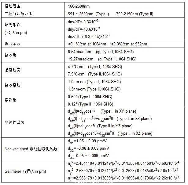 LBO晶體的線性和非線性系數(shù):