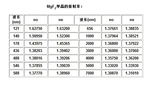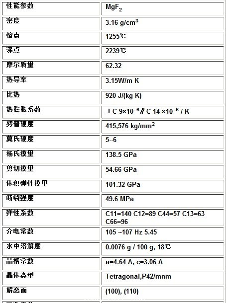 MgF2單晶廣泛應用于激光、紅外、紫外光學、高能探測等科技領域. 廣泛應用于紫外光電倍增管,準分子激光器及可見紅外光學系統(tǒng)中。 產(chǎn)品介紹 單晶的性能參數(shù):